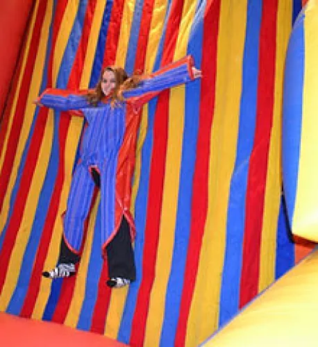 OK, I know it sounds crazy. But, slip into this Velcro suit. Whether you're a child, teen, or adult, You'll look so cute! Now, here comes the fun part! Run and Jump at this wall. Imagine what happens when Velcro meets Velcro! So, go ahead now! Don't stall!